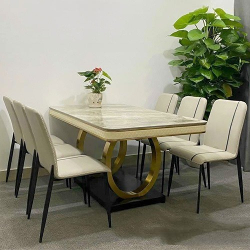 - Bàn ăn mặt đá phong cách tân cổ điển được cấu tạo từ mặt đá ceramic viền inox mạ vàng áp dụng công nghệ mới chống trầy xước, chống ố, chịu được nhiệt độ cao mang tới vẻ bóng đẹp vượt trội, dễ dàng vệ sinh lau chùi, vì vậy sản phẩm được ưa chuộng sử dụng ở nhiều không gian nội thất khác nhau.