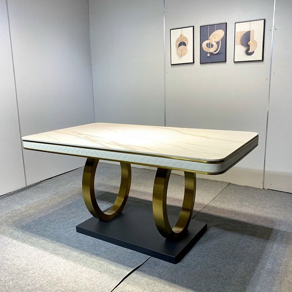 - Bàn ăn tân cổ điển mặt đá cao cấp được cấu tạo từ mặt đá ceramic viền inox mạ vàng áp dụng công nghệ mới chống trầy xước, chống ố, chịu được nhiệt độ cao mang tới vẻ bóng đẹp vượt trội, dễ dàng vệ sinh lau chùi, vì vậy sản phẩm được ưa chuộng sử dụng ở nhiều không gian nội thất khác nhau.