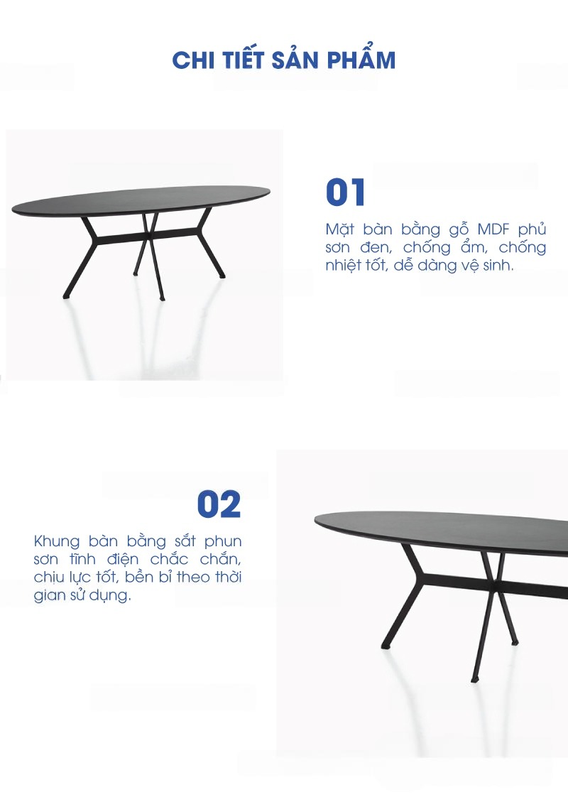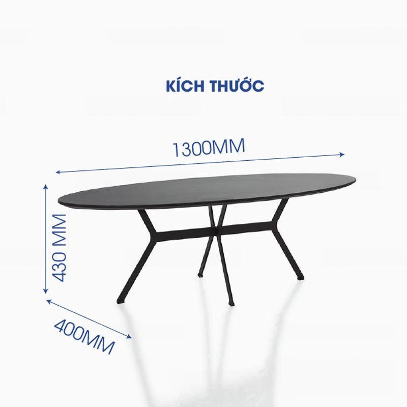 | Thiết kế | Bàn có thiết kế cao cấp, hiện đại, phù hợp với không gian cafe, bar, nhà hàng. Mặt bàn rộng hình Oval đáp ứng số lượng người dùng lớn. Chân bàn độc lập thiết kế cách điệu giúp không gian thoáng đãng hơn. |