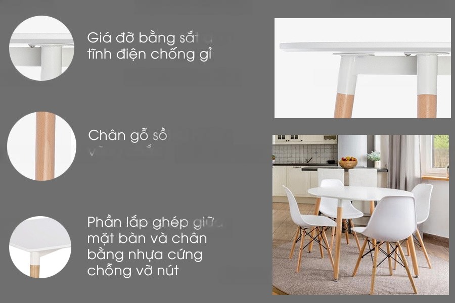 | Chất liệu | Chân bàn bằng gỗ sồi sang trọng Mặt bàn bằng gỗ MDF phủ Combosit không ẩm mốc, chống mối mọt, dễ dàng vệ sinh. |