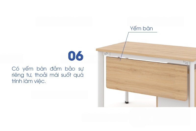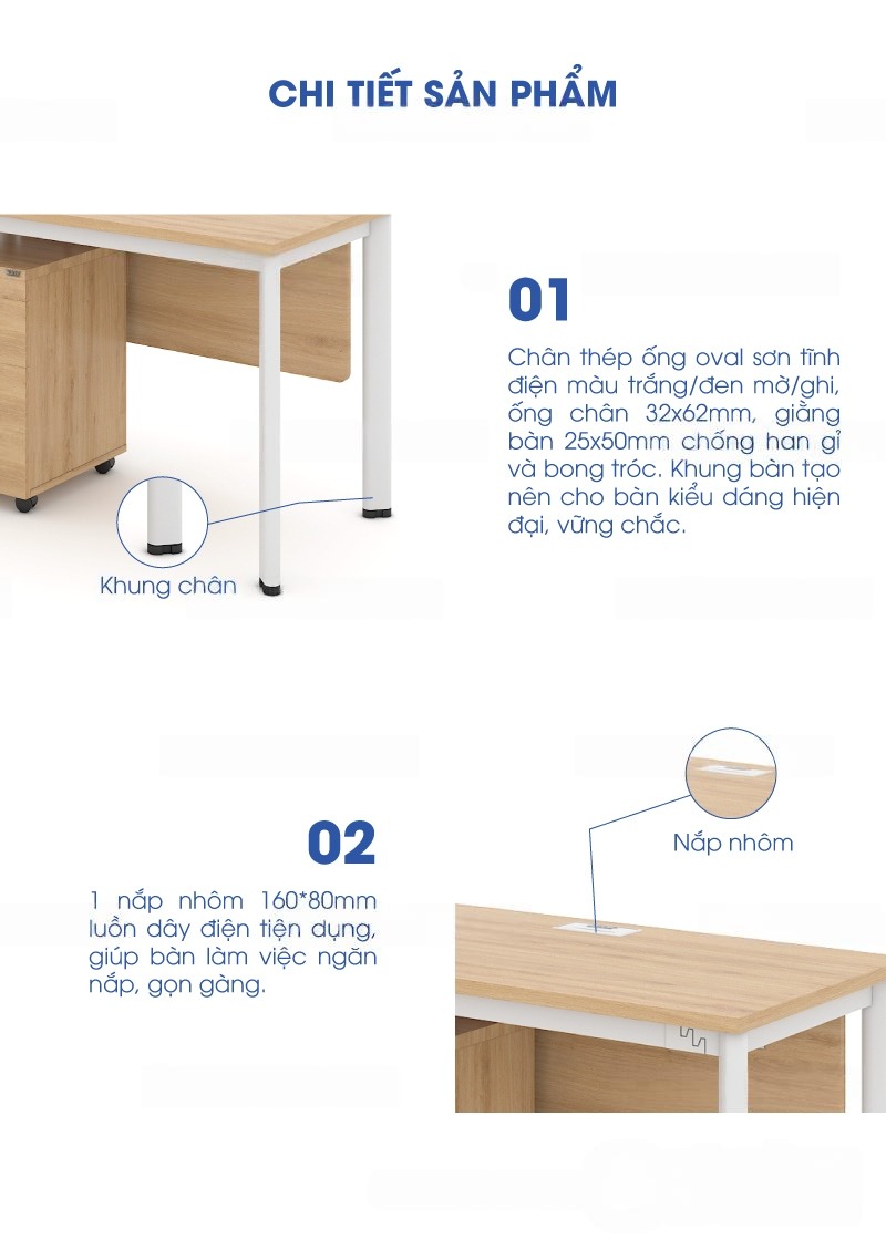 Mặt bàn có lắp 01 nắp nhôm 160*80mm luồn dây điện tiện dụng, giúp bàn làm việc ngăn nắp, gọn gàng.