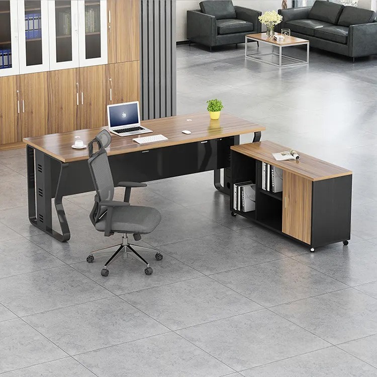 - Mặt bàn màu nâu vân gỗ hiện đại phối đen, mang lại sự sang trọng cho văn phòng.