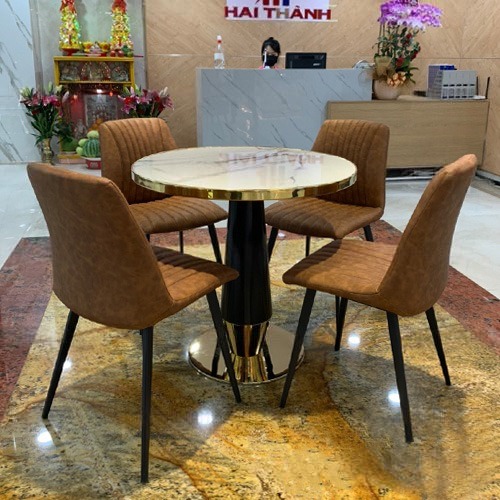 - Chất liệu: Bàn mặt mica giả đá viền inox mạ vàng, chân thép sơn tĩnh điện đế mạ vàng; Ghế lưng nệm bọc da PU, chân thép sơn tĩnh điện.
