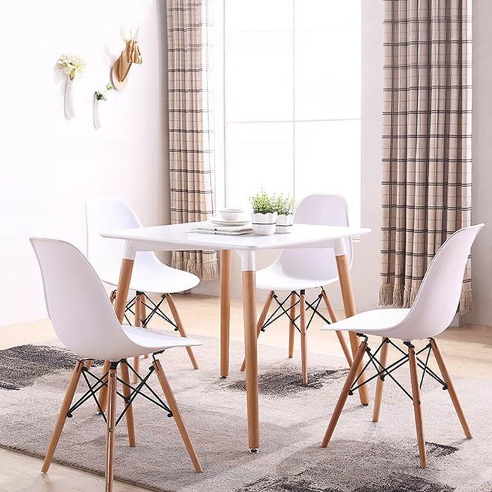 - Bộ bàn ăn, cafe cho 4 người gồm bàn T108 0.8×1.2×0.75m và 4 ghế eames nhựa lót nệm chân gỗ 205