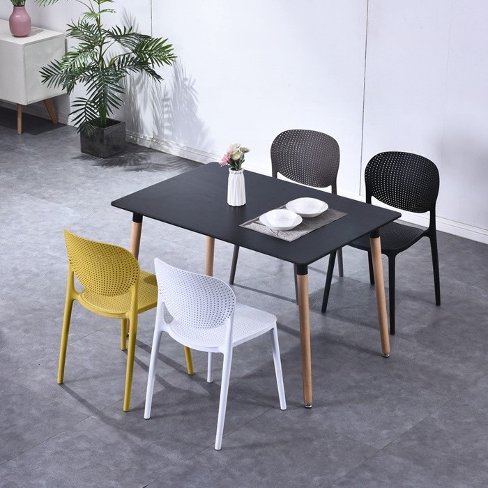 - Mặt bàn bằng gỗ MDF sơn phủ Composite có độ bền vượt trội và giữ vẻ sáng mới dài lâu vì chống xước, không bám bụi. Ghế được chế tạo từ lưng nhựa PP đúc nhiều màu sắc đi kèm với khả năng xếp chồng mang đến vẻ đẹp hiện đại, tinh tế, sang trọng đồng thời rất tiết kiệm diện tích cho không gian phòng ăn gia đình.