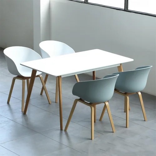 - Chất liệu: Bàn: Mặt gỗ MDF sơn phủ composite, chân gỗ beech; Ghế: nhựa PP đúc nguyên khối