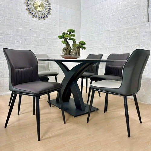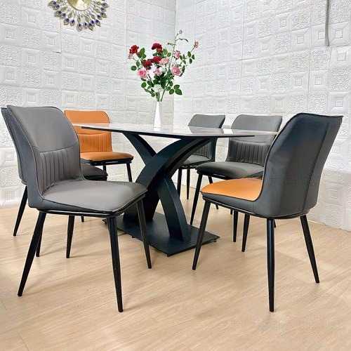 - Chất liệu: Mặt bàn đá ceramic, chân thép sơn tĩnh điện; Ghế bọc nệm da PU, chân thép sơn tĩnh điện.