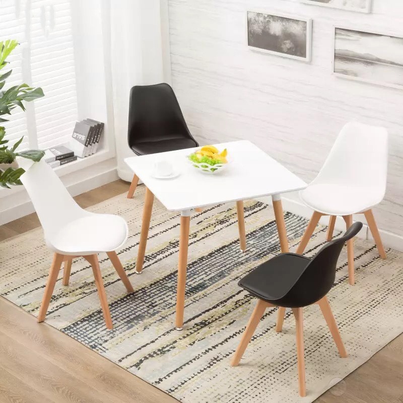 - Bộ bàn ăn, cafe cho 4 người gồm bàn T108 0.8×1.2×0.75m và 4 ghế eames nhựa lót nệm chân gỗ 205