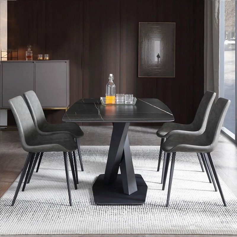 - Chất liệu: Bàn mặt đá, chân thép sơn tĩnh điện; Ghế bọc da PU, chân thép sơn tĩnh điện.