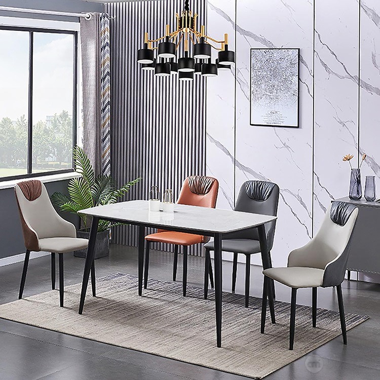 - Vật liệu: Ghế: Bọc da PU chân thép sơn tĩnh điện; Bàn: Măt đá ceramic, chân thép sơn tĩnh điện.