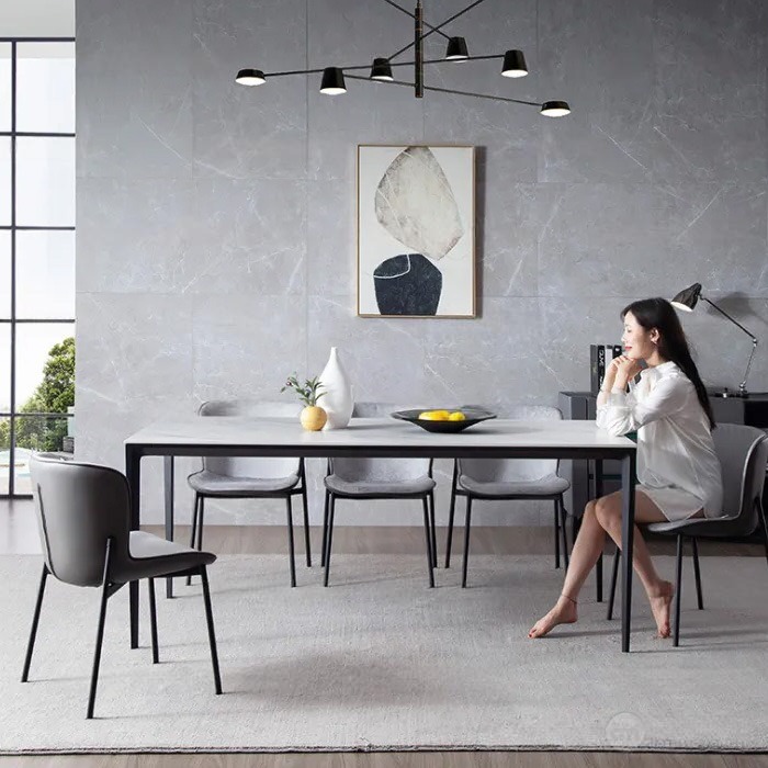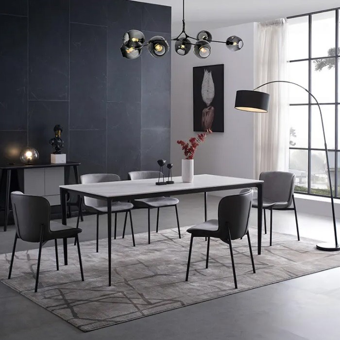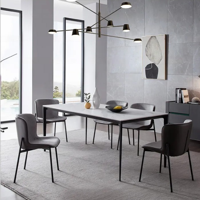 - Chất liệu: Mặt bàn đá, chân nhôm sơn tĩnh điện; Lưng bọc da PU, mặt ngồi bọc vải, chân thép sơn tĩnh điện.