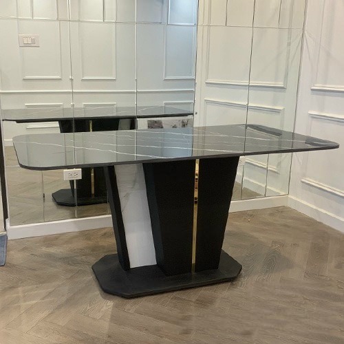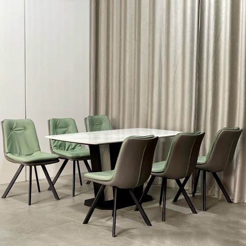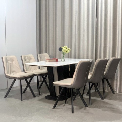 - Chất liệu: Mặt bàn đá ceramic, chân thép sơn tĩnh điện ốp đá viền inox mạ vàng; Ghế bọc nệm da PU, chân thép sơn tĩnh điện.