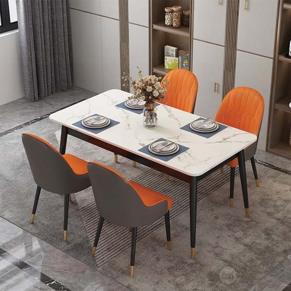 - Màu sắc: Bộ bàn ăn mặt đá khung thép 4 ghế nệm hiện đại êm ái, thiết kế cách điệu có bàn màu trắng mang tới phong cách tinh tế. Bạn có thể chọn nhiều mẫu ghế với các gam sắc ấn tượng như: Màu Xanh dịu mắt. Màu Kem tinh tế. Màu Xám trang nhã. Màu Nâu thân thuộc. Màu Cam nổi bật.