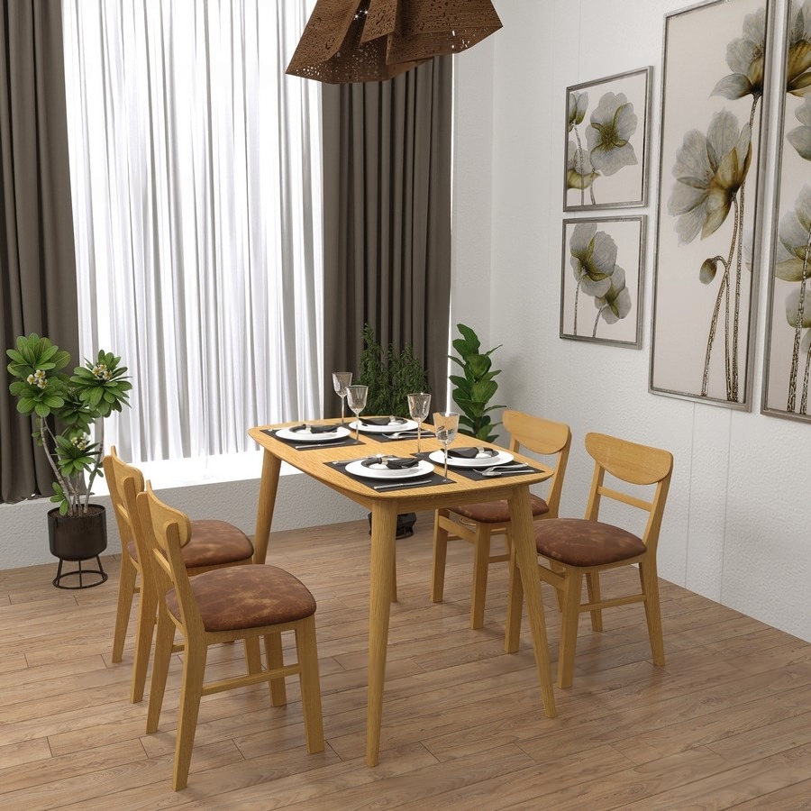 Bộ bàn ghế ăn mango 4 chỗ màu tự nhiên cókích thước vừa đủ để không chiếm quá nhiều diện tích của phòng ăn. Chỉ cần một góc nhỏ với bộ bàn ăn, bạn đã có một bữa cơm gia đình đầm ấm. Thiết kế mang phong cách Hàn quốc rất phù hợp với căn hộ chung cư, đặc biệt là các gia đình trẻ. Tuy đơn giản nhưng bộbàn ăn này vẫn mang đến vẻ đẹp sang trọng, hiện đại cho không gian nhà bạnvới tone màu trắng phối thêm màu cánh gián trên mặt bàn và nệm ghế, tạo nên nét sang trọng, hiện đại cho căn phòng, đồng thờidễ dàng kết hợp với nhiều tone màu khác nhau của đồ nội thất trong nhà.