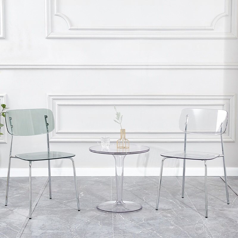 - Chất liệu: Bàn nhựa PC trong suốt đúc nguyên khối; Ghế: Lưng nhựa PC trong suốt, khung thép mạ crom