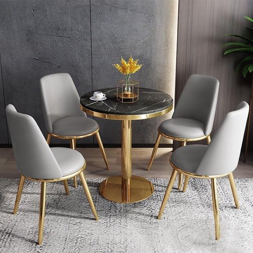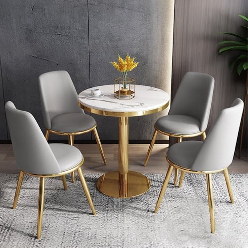 - Chưa dừng lại ở đó, bộ sản phẩm được trang bị đi kèm 4 ghế có nệm da, chân thép mạ màu gold. Nhờ thế, nội thất thêm đồng bộ, tăng tính tinh tế, củng cố độ sang trọng cho không gian bài trí hiệu quả.