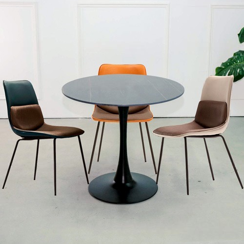 - Chất liệu: Mặt bàn đá ceramic, chân thép sơn tĩnh điện; Ghế bọc da PU, chân thép sơn tĩnh điện.