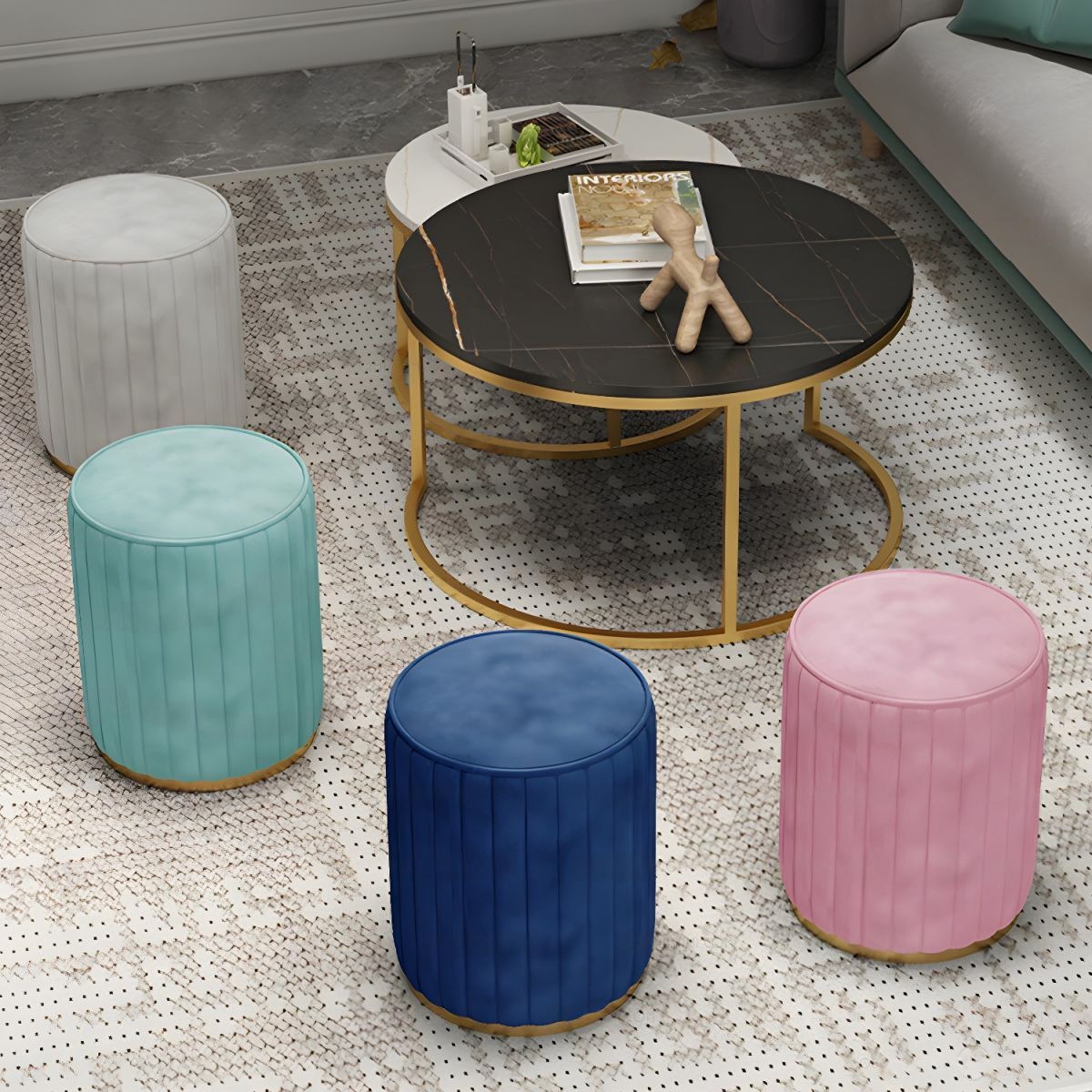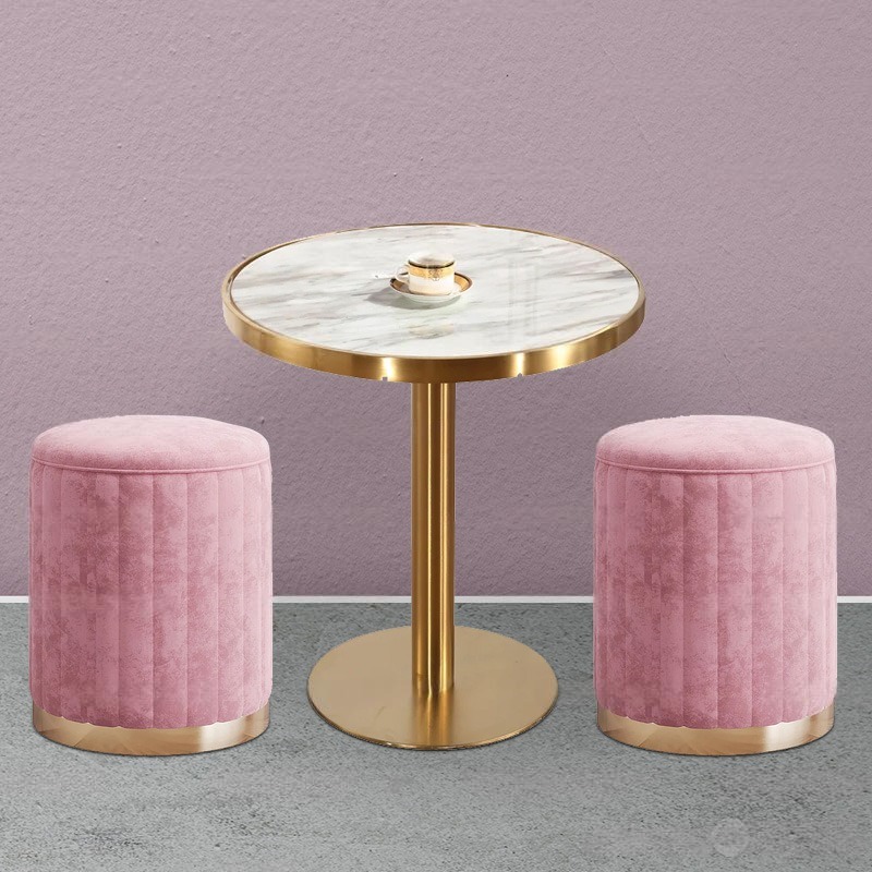 - Vật liệu của sản phẩm: Mặt bàn làm bằng mica giả đá, chân inox được mạ vàng và ghế được bọc nhung.