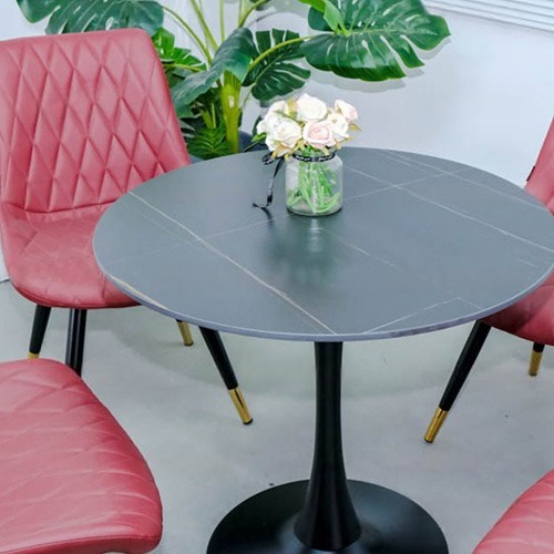 - Chất liệu: Bàn: mặt đá, chân thép sơn tĩnh điện; Ghế: Lưng bọc nệm da, chân thép sơn tĩnh điện bọc ống inox mạ vàng.