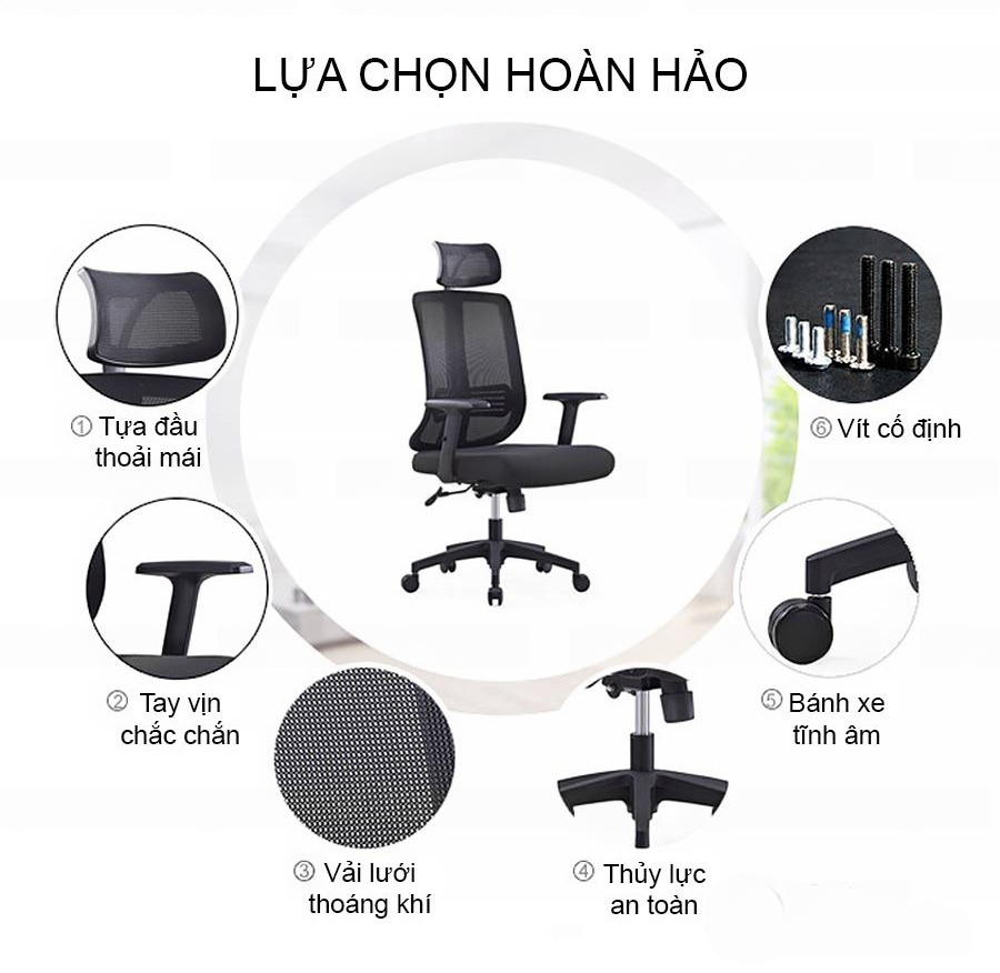 • chất-liệu: Lưng lưới kết hợp nệm mút êm ái, Chân sao được làm từ nhựa nguyên sinh chắc chắn, Có pistong nâng hạ, Bánh xe di chuyển 360 độ, Tựa đầu chữ T có thể chỉnh phù hợp chiều cao từng người