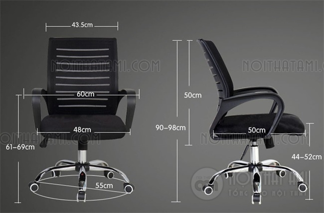 - Chất liệu:Khung lưng bằng nhựa cao cấp chịu lực, được bọc lưới có lumbar support. Đệm ngồi mút đúc mềm mại. Tay cố định ốp nhựa đen cao cấp. Chân ghế nhựa cao cấp