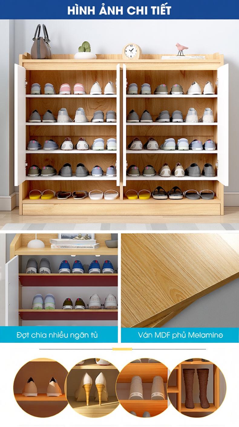 Tủ có thiết kế 3 phần, phần trên không chia ngăn để trang trí, đặt lọ hoa, đồ dùng. Phần thân tủ được chia thành 2 khoang dọc có lắp thêm cánh cửa, mỗi khoang chia thành 4 ngăn khác nhau để đựng giày dép. Hàng dưới cùng là một ngăn ngang được thiết kế không cánh để dép thường xuyên đi lại.