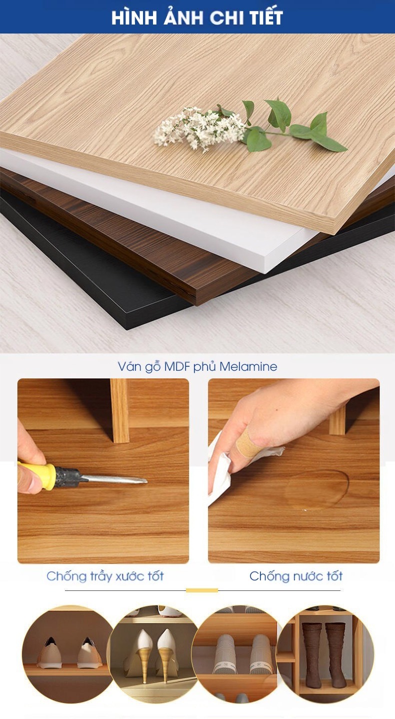 | Công dụng | Sản phẩm đáp ứng đầy đủ các yêu cầu về việc để giày tại các không gian công cộng hoặc tại gia đình. Ngoài ra tủ để giày có tính thẩm mỹ cao, nên thường được sử dụng trong các khu vực công cộng dịch vụ cao cấp và sang trọng.(đặc biệt có nhiều sự lựa chọn vân gỗ và dễ tạo hình theo nhu cầu người dùng).