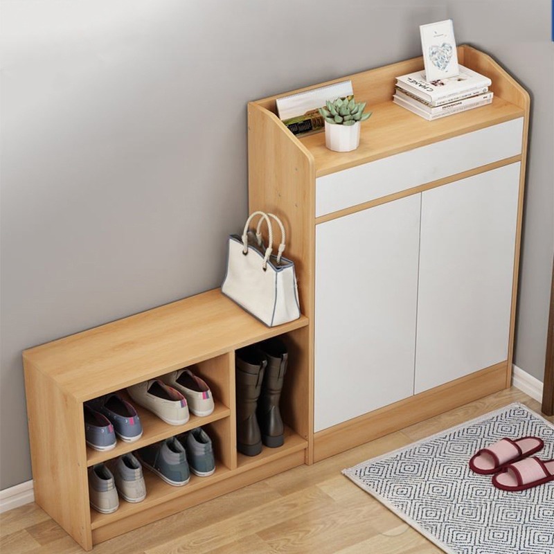 Mẫu tủ giày này được thiết kế thông minh được thiết kế thành 2 mảng riêng biệt. Một bên được thiết kế dạng tủ kín có cánh mở màu trắng phía bên trên là ngăn đựng sách báo, tài liệu, cây trang trí. Một bên thiết kế ngăn thấp dạng tủ không cánh với nhiều kích thước khác nhau sử dụng để giày thể thao, bệt, boot, … hay sử dụng thuận tiện. Ngăn trên cùng có thể tận dụng để túi xách. Với thiết kế hiện đại, hài hòa về kiểu dáng màu sắc chiếc tủ giày thông minh này phát huy tối đa công năng sử dụng đồng thời mở ra không gian sống gọn gàng, đẹp mắt.