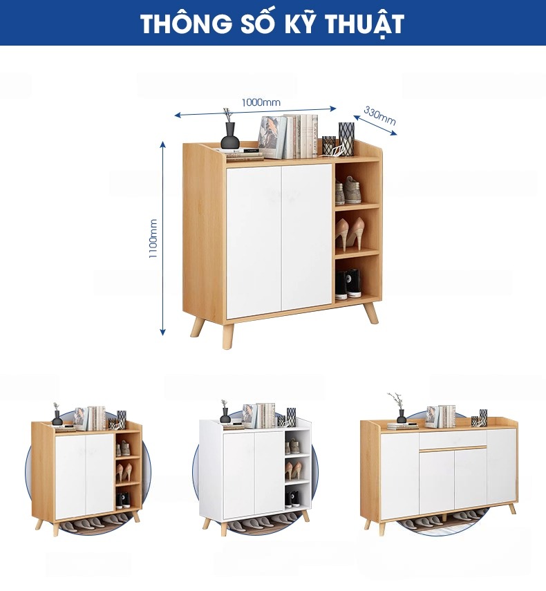 Tủ có thiết kế 3 phần, phần trên không chia ngăn để trang trí, đặt lọ hoa, đồ dùng. Phần thân tủ được chia thành 2 khoảng dọc một khoang có cánh mở, 1 khoang không cánh, mỗi khoang chia thành 4 ngăn khác nhau để đựng giày dép. Có thể điều chỉnh ngăn chứa theo mục đích sử dụng: giày cao gót, giày bệt, dép…Có thể sắp xếp những đôi giày thường xuyên đi lại ở khoang không cánh để dễ dàng sử dụng.Phần dưới là 4 chân tủ thiết kế độc lập, chắc chắn.