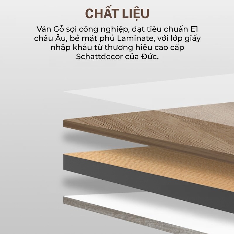 | Chất liệu | Ván gỗ đạt tiêu chuẩn E1 Châu Âu,với lớp giấy được nhập khẩu từ thương hiệu cao cấp Schattdecor của Đức, với lớp vân gỗ rõ ràng và tự nhiên. | |||