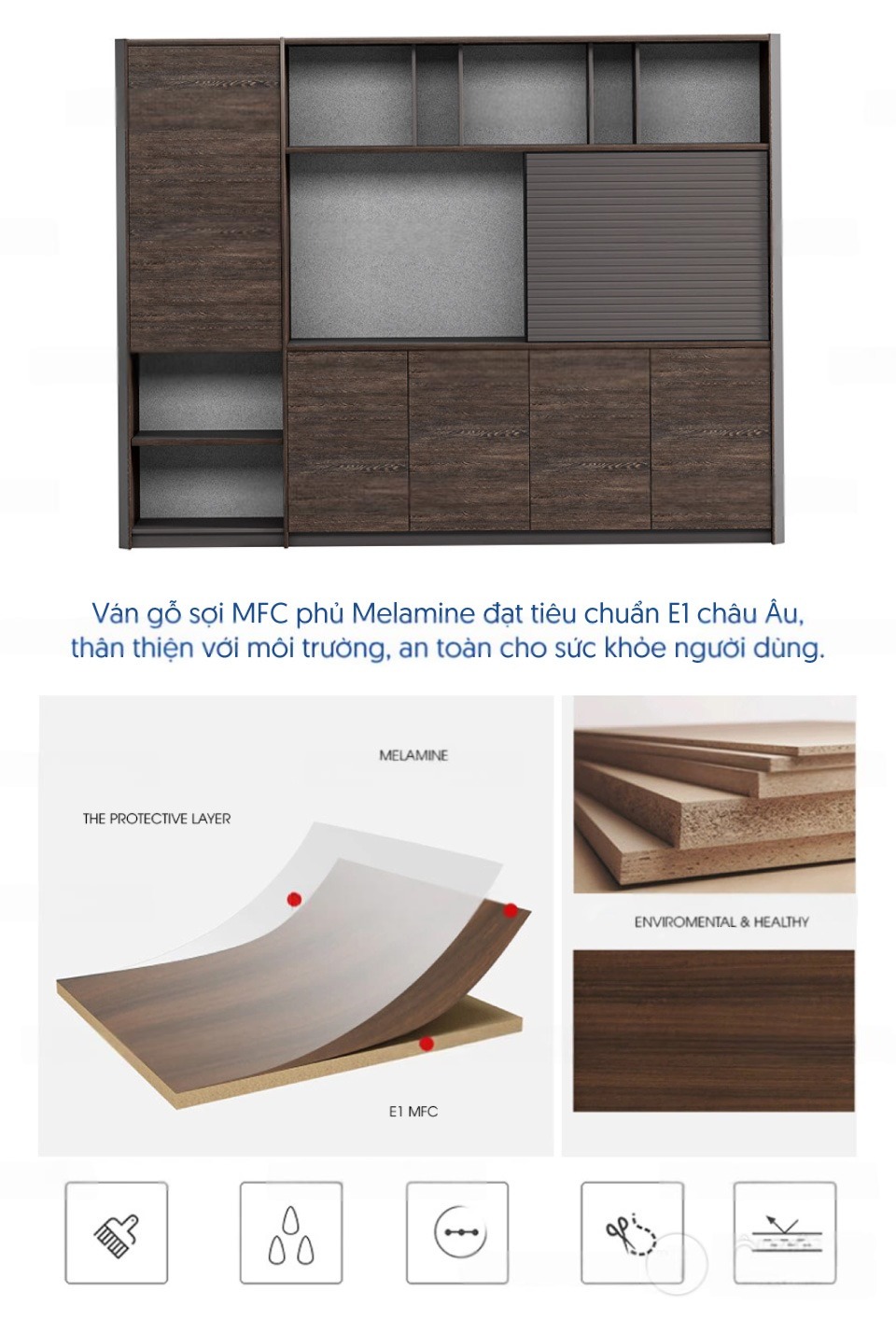 | Chất liệu | Ván Gỗ sợi MFC phủ Melamine và lớp sơn bảo vệ, đạt tiêu chuẩn E1 châu Âu, thân thiện với môi trường, an toàn với sức khỏe người sử dụng,