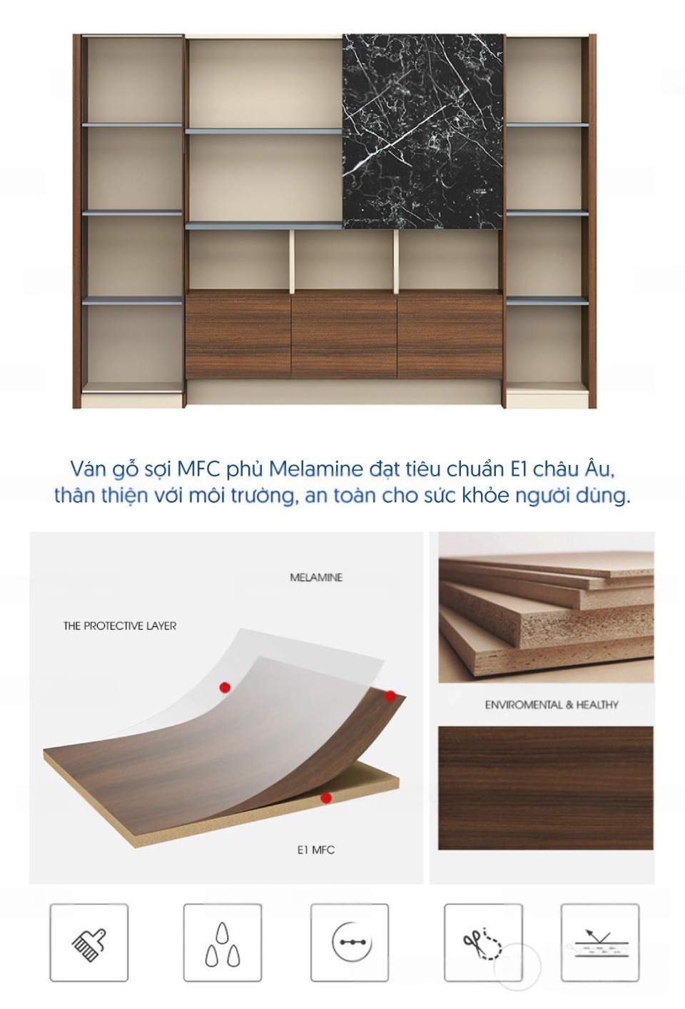 | Chất liệu | Ván gỗ sợi MFC phủ Melamine đạt tiêu chuẩn E1 châu Âu, thân thiện với môi trường, an toàn cho sức khỏe người dùng.