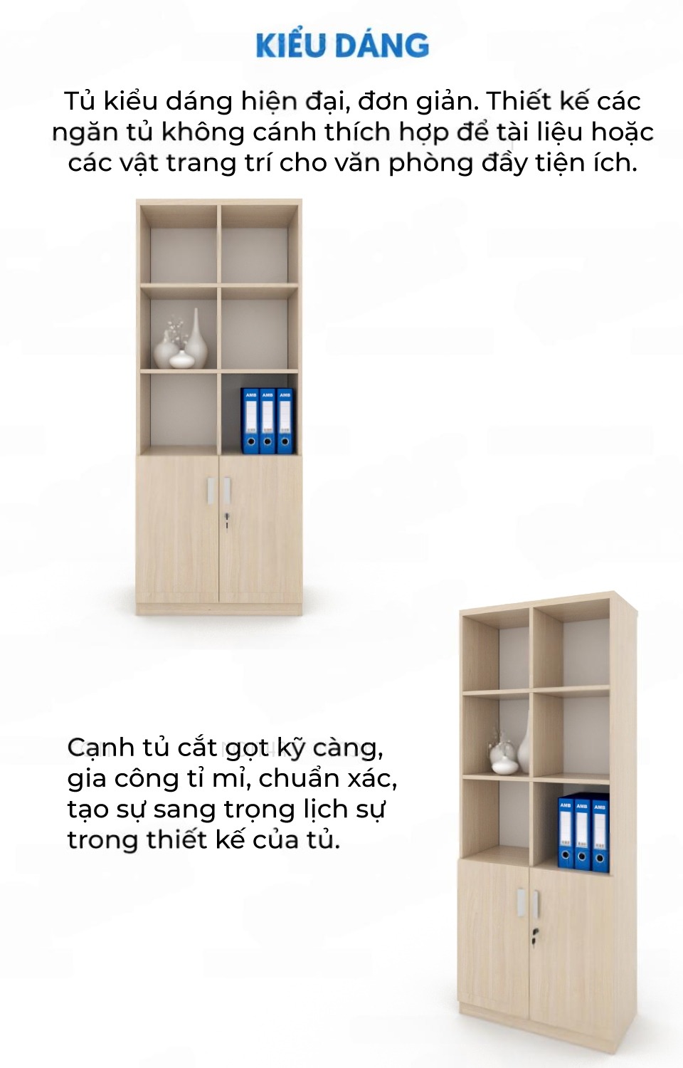 | Kiểu dáng | Tủ kiểu dáng hiện đại, đơn giản. Thiết kế 2 cánh cửa đóng kín có tay cầm ở ngăn dưới cùng giúp cất giữ tài liệu, đồ dùng cá nhân khoa học, ngăn nắp hơn. 3 ngăn tủ hở phía trên có thể dùng trang trí đồ decor văn phòng hoặc để hồ sơ, giấy tờ. | |||