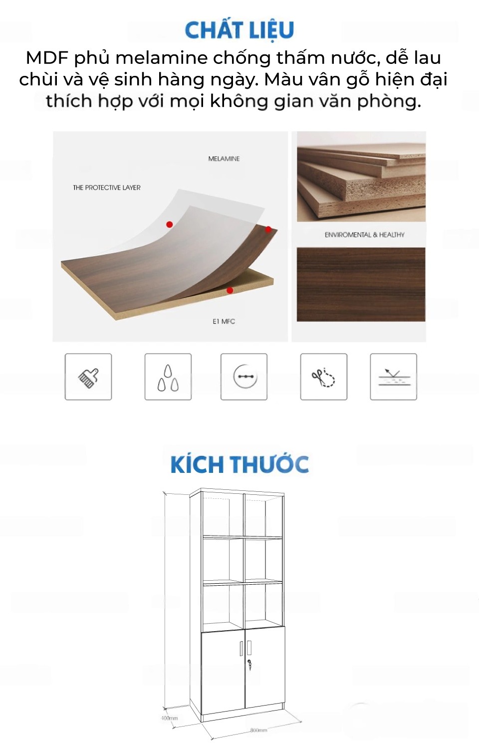 | Chất liệu | MDF phủ melamine chống thấm nước, dễ lau chùi và vệ sinh hàng ngày. Màu vân gỗ hiện đại thích hợp với mọi không gian văn phòng. | |||