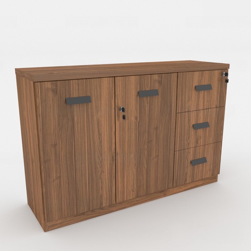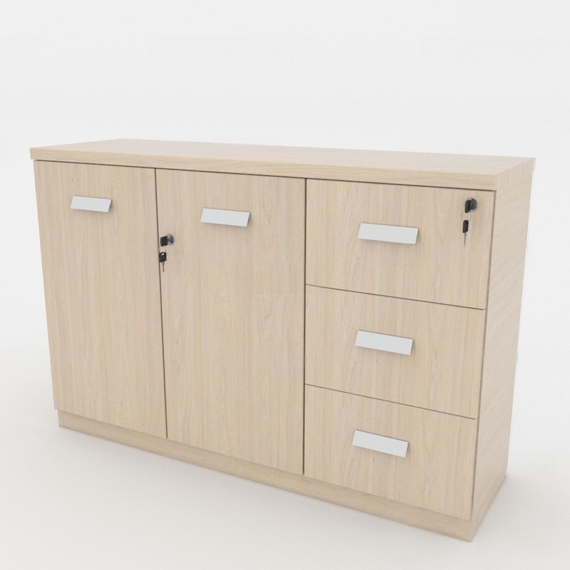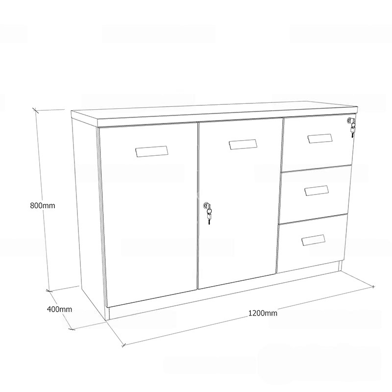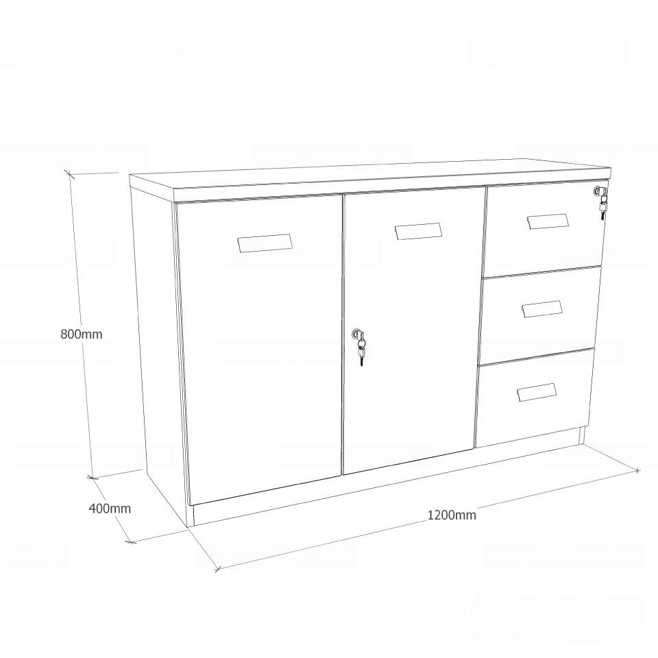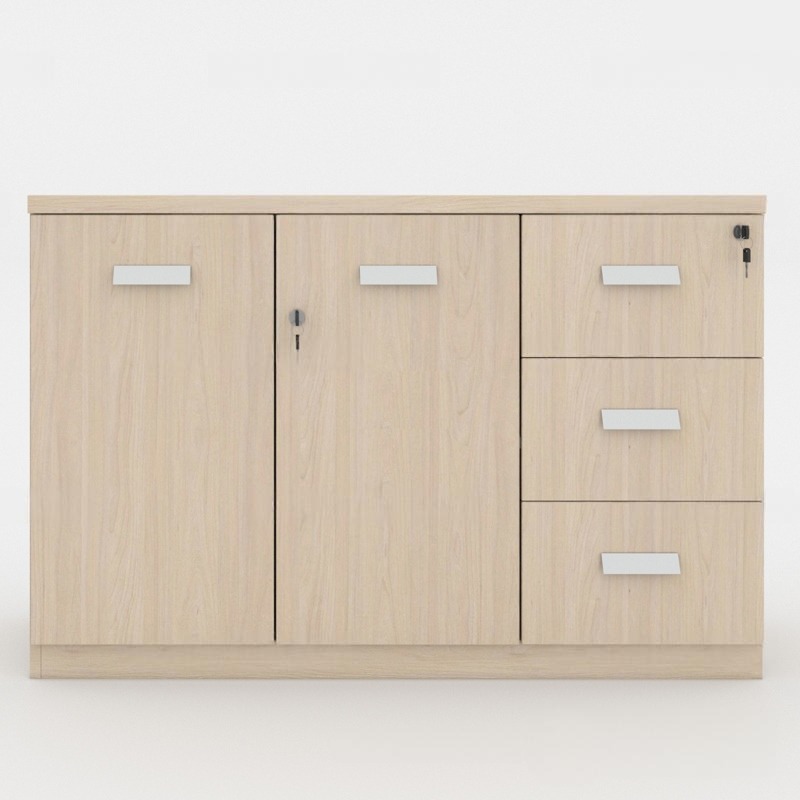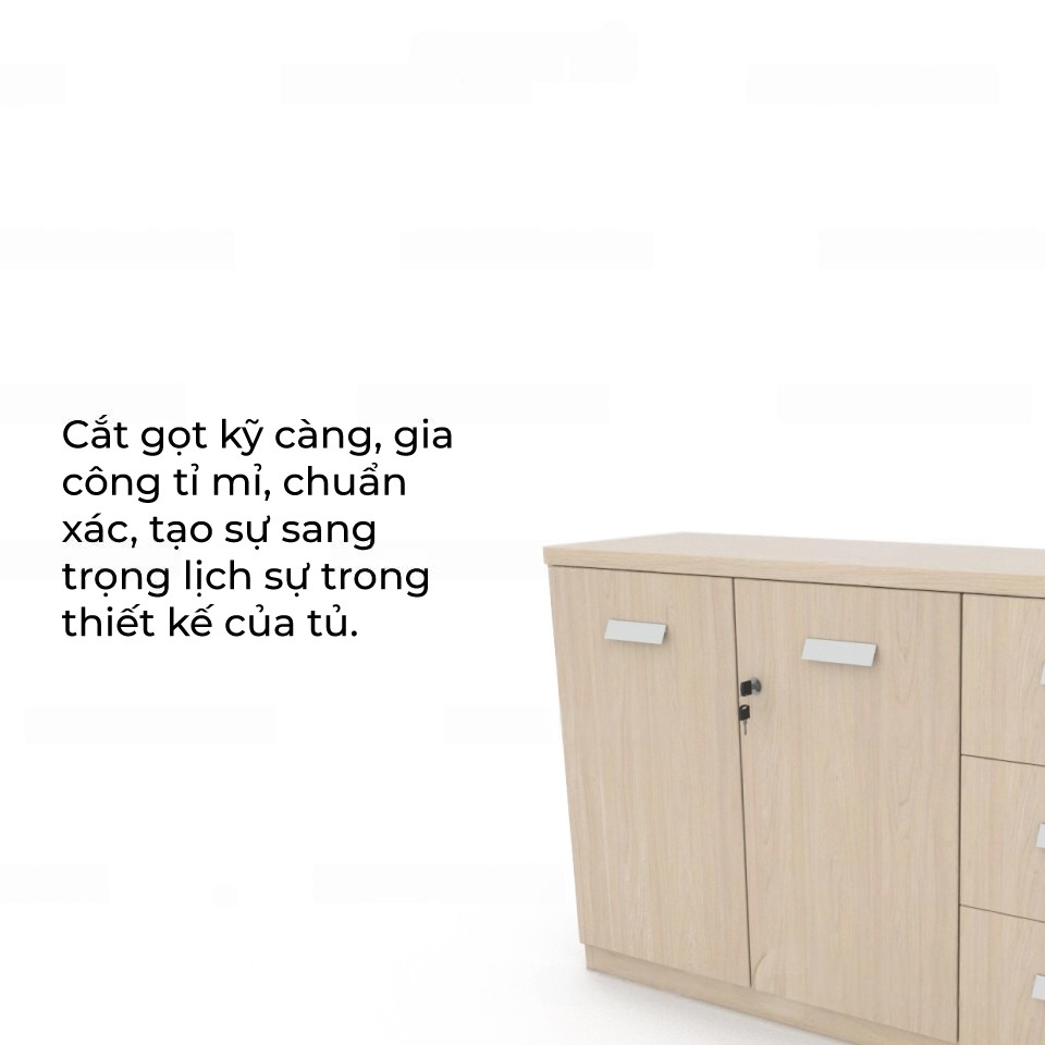 Tủ được thiết kế hiện đại, đơn giản được làm bằng gỗ công nghiệp có độ bền cao, có khả năng chịu lực tốt. Tủ được thiết kế thành 2 buồng với kích thước rộng rãi. Buồng bên trái gồm 2 cánh cửa gỗ, 1 đợt cố định chia không gian thành 2 ngăn ngang riêng biệt, 2 tay nắm và một ổ khóa. Còn phần buồng bền phải được chia thành 3 ngăn kéo có 3 tay nắm và 1 ổ khóa để tài liệu. Tủ được thiết kế tối giản mọi chi tiết, chia thành nhiều ngăn giúp việc bảo quản lưu trữ tài liệu ngăn nắp gọn gàng.