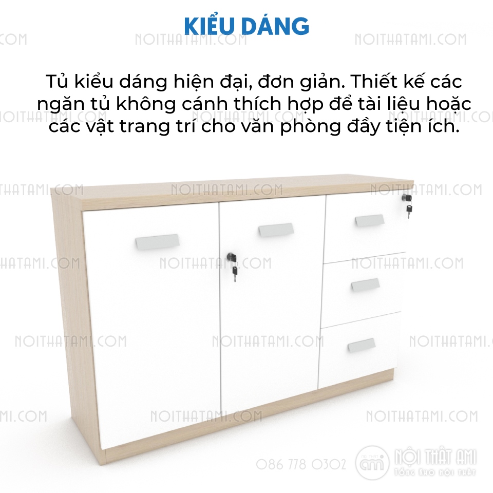 | Kiểu dáng | Tủ kiểu dáng hiện đại, đơn giản. Thiết kế gồm 2 cánh kín đóng và 3 hộc tủ ngoài cùng giúp lưu trữ tài liệu, giấy tờ khoa học, ngăn nắp hơn. | |||